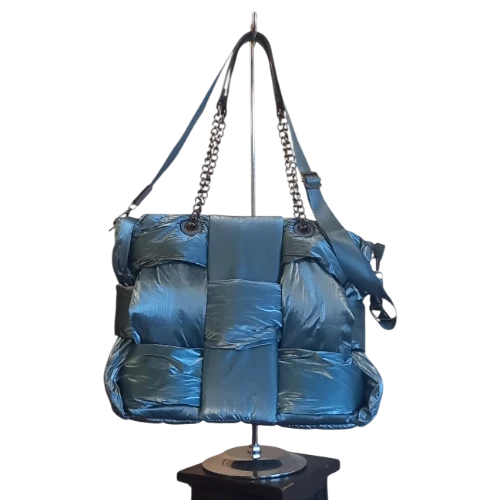 Borsa puffy imbottita con design a scacchiera/intreccio per un effetto voluminoso e moderno. Tessuto lucido, manici superiori e tracolla staccabile con inserti a catena: versatile e d’impatto.