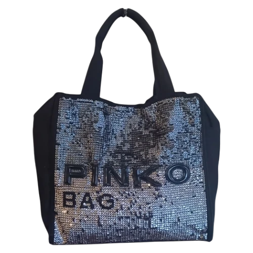 Tote/shopping bag in tela con logo “PINKO BAG” realizzato in paillettes nero e argento sul frontale. Manici in tessuto nero: pratica e grintosa.