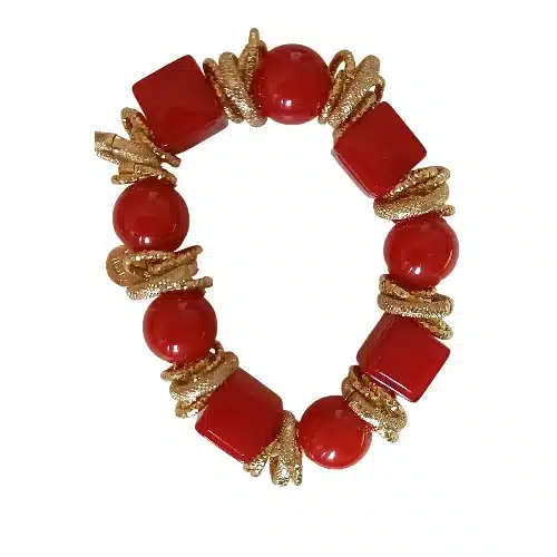 Braccialetto con perle rosse e dettagli dorati lavorati.