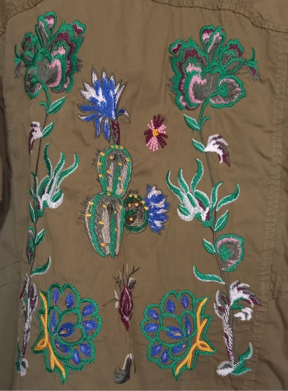 Giacca vintage firmata Vicolo, caratterizzata da una particolare stampa floreale sul retro. Ideale per un look unico e di carattere.