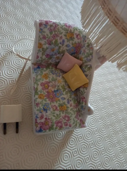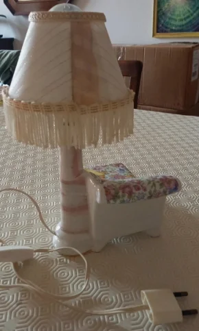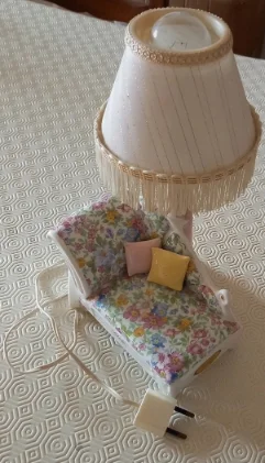 Lampada vintage con base in porcellana a forma di chaise longue con cuscini. Il paralume in tessuto con dettagli glitterati e nappine rende questo pezzo unico perfetto per un arredamento romantico e raffinato.