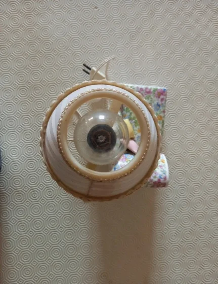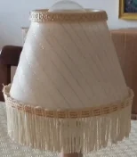Lampada vintage in porcellana con paralume in tessuto con glitter e nappine. Anni ‘70.