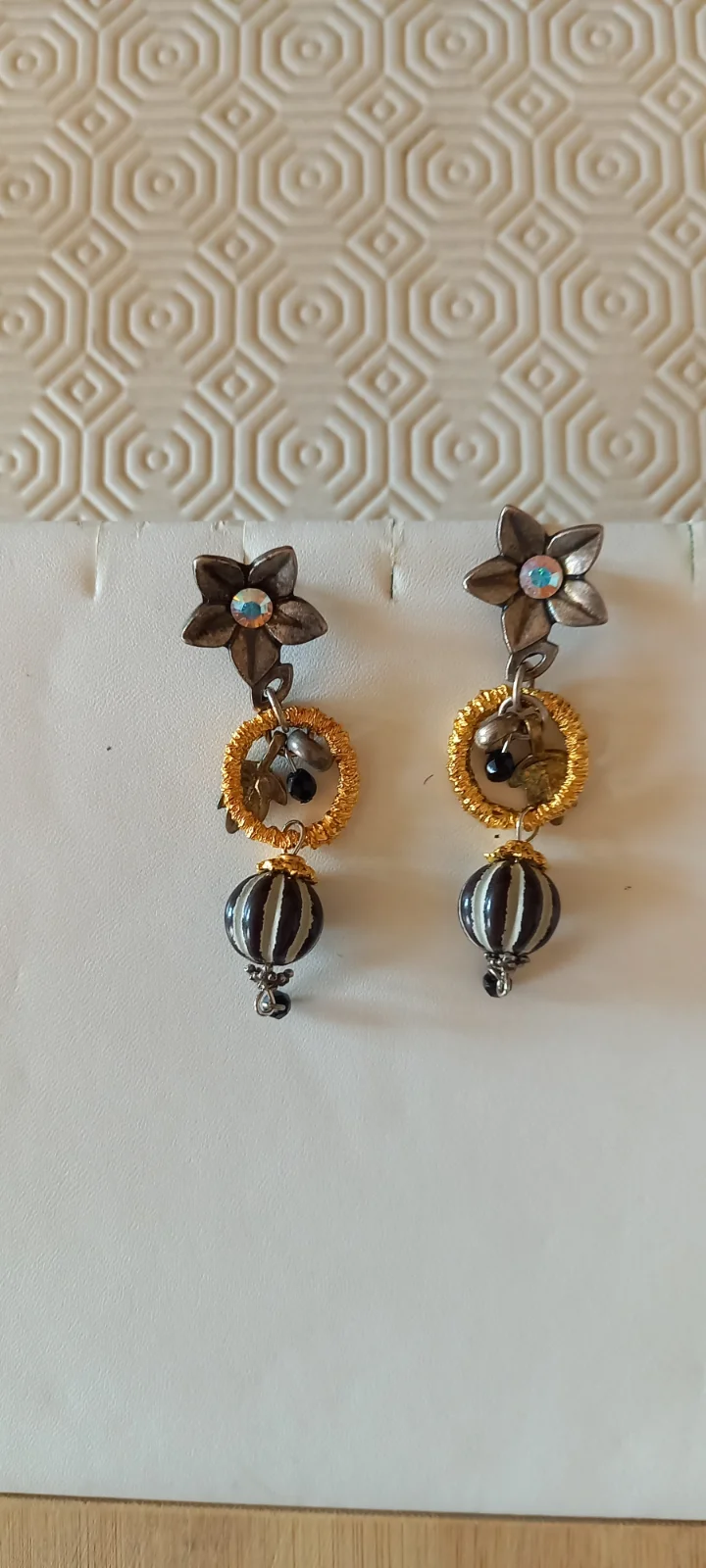 Eleganti orecchini pendenti con dettagli unici: pendente a forma di fiore con strass, anello dorato con foglioline e perline nere, pallina a righe bianche e nere. Pezzo unico dallo stile vintage.