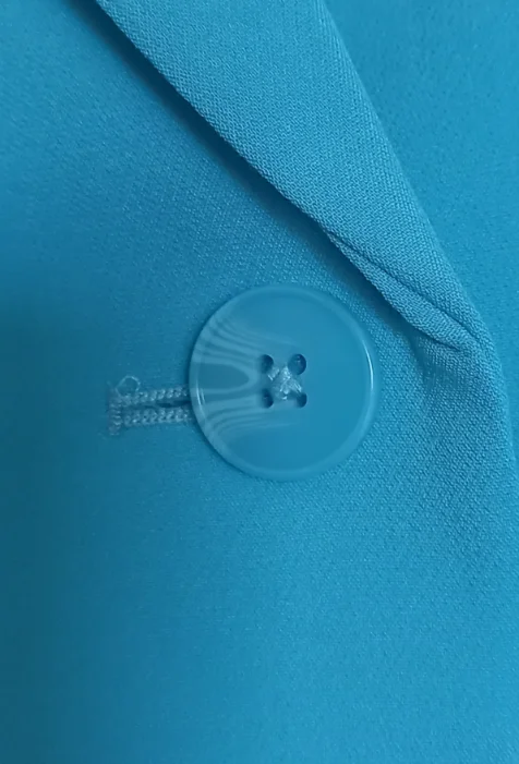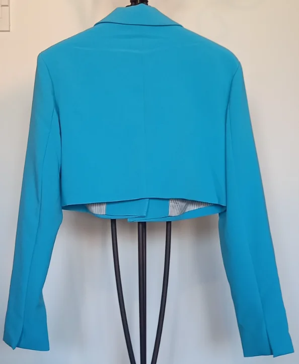 Giacca corta elegante turchese con spallotti e bottone. Taglia M.