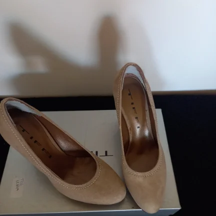 Scarpe beige in camoscio sabbia, tacco alto e comodo, punta affusolata.